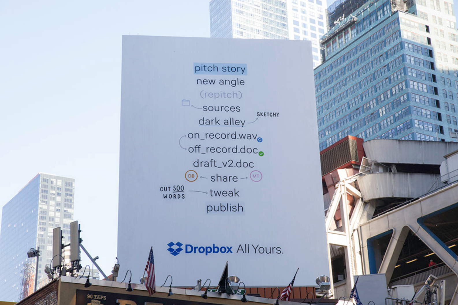 These geo-specific OOH ads were part of a multi-faceted Dropbox branding campaign that explored the idea that a cloud-based storage platform could be so much more than just a cloud-based storage platform. I worked closely with senior creatives to understand the process various professionals take to make their work happen. The Billboard and poster you see here speaks to the creative process of Journalists and Startup Entrepreneurs. This campaign targeted professionals were where they might be found (e.g. next to NY Times or Silicon Valley).